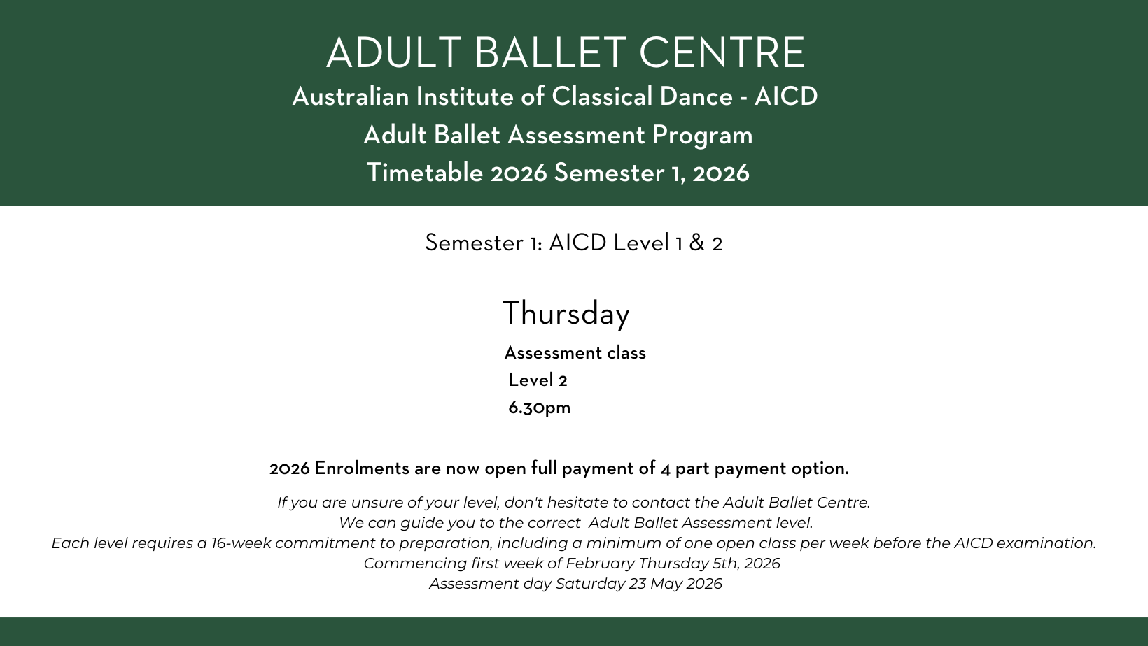 When you book your class AICD level, you will have the option to activate a four-part payment plan or pay in full. If you already know your level, you can book directly via our website or mobile app, just navigate to the week of Saturday 1 February 2026 to secure your place. If you require guidance please email directly to manager@adultballetcentre.com